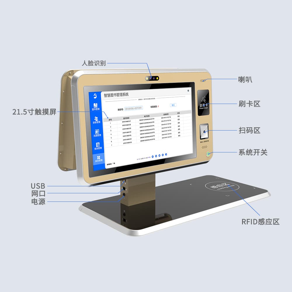 馆员工作站,集双屏触控、RFID识别于一体,专为图书管理设计。支持快速录入图书信息,转换标签,选配二维码扫、人脸识别模块。操作简便,提升管理效率,满足多样化需求。