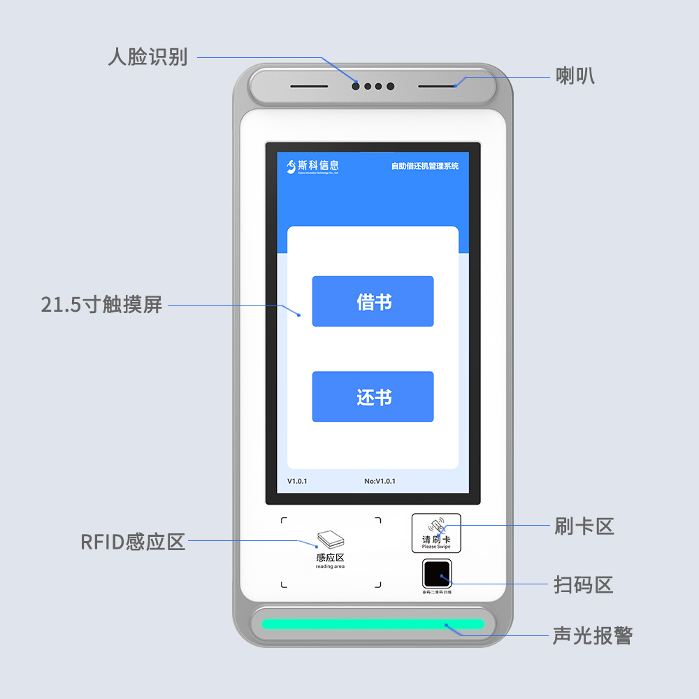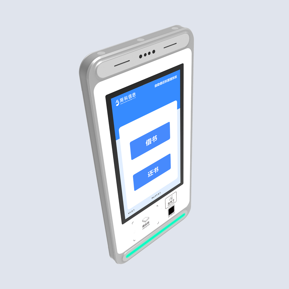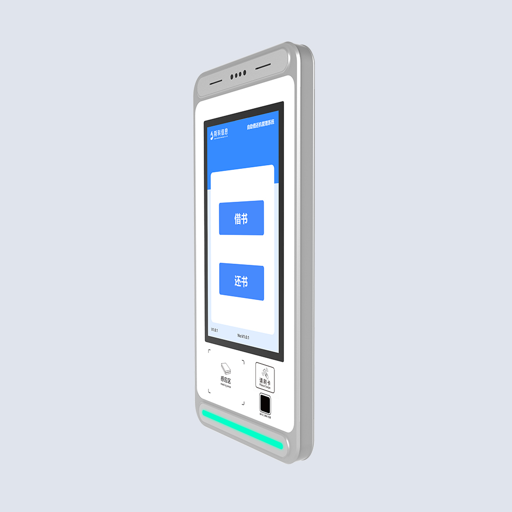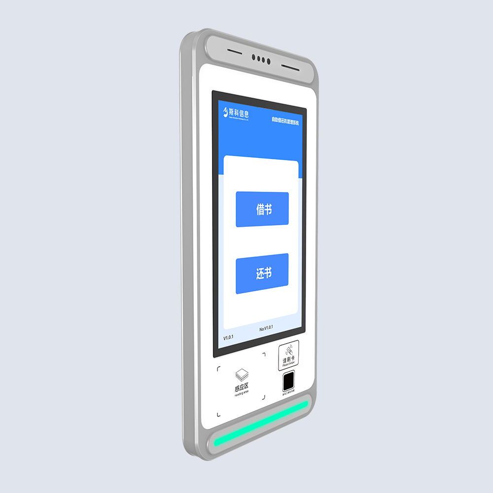 自助借还机,采用挂壁式安装,节省空间。集RFID读写器与天线于一体,配备21.5寸电容触摸屏,当有领用或者归还时,在一体机前读取,进行智能识别,管理进出。