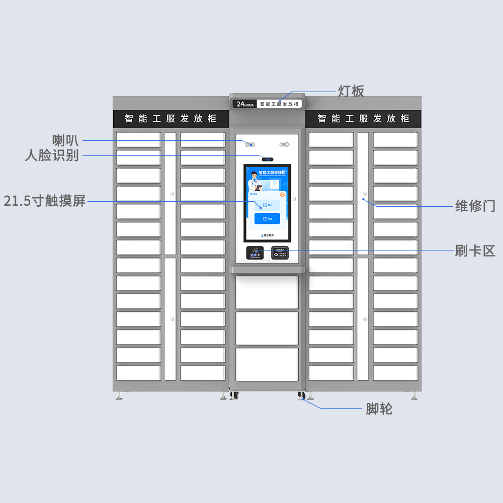 RFID工服管理柜采用模块化集群架构与生物特征识别技术,实现作业服全生命周期管理。配备工业级触控终端与自适应格口分配算法,主副柜体智能组网支持59个独立存储单元,单次认证响应时间≤0.8秒,满足高并发领用需求。
